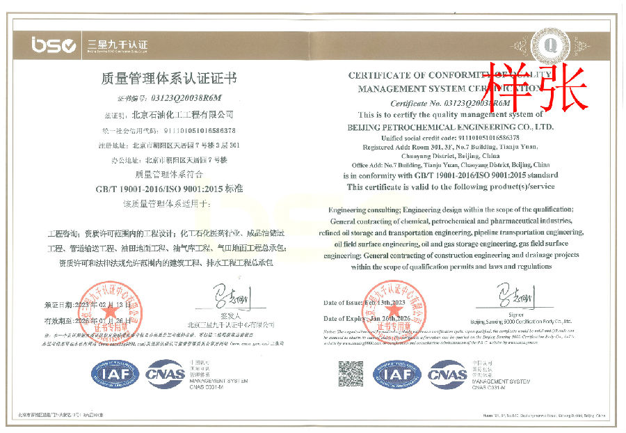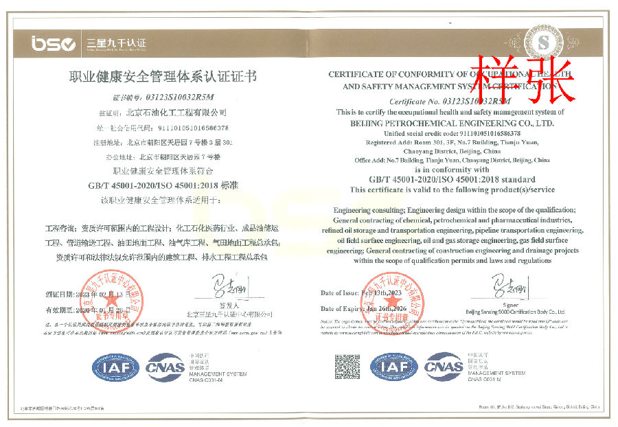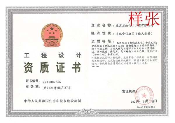 電力行業(新能源發電)專業乙級;建筑行業(建筑工程)乙級;商務糧行業(成品油儲運工程)專業乙級;石油天然氣(海洋石油)行業(管道輸送、油田地面、油氣庫)專業乙級;市政行業(排水工程)專業乙級。
