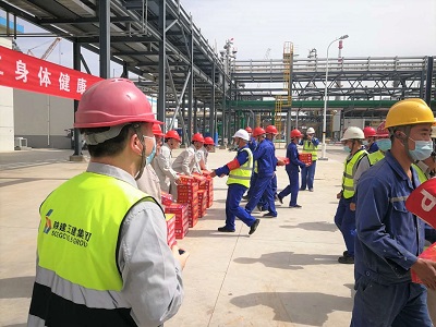 集團領導首先來到項目現場,對集團各參建單位職工進行了親切慰問,并為大家發放了防暑降溫慰問品。同時,詳細詢問了項目組高溫天氣的防暑降溫措施和職工身體狀況,叮囑各單位現場負責人,要合理安排工作,注意勞逸結合,強化安全意識,將防暑降溫、疫情防疫和安全生產工作相結合,切實保障工程施工安全、按時保質完成項目建設任務。