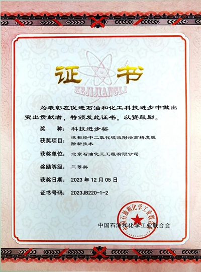 近日,中國石油和化學工業聯合會公示了《2023年度科學技術獎》獲獎成果,北京石油化工工程有限公司“液相烴中二氧化硫吸附法高精度脫除新技術”榮獲2023年度中國石油和化學工業聯合會科技進步獎三等獎。