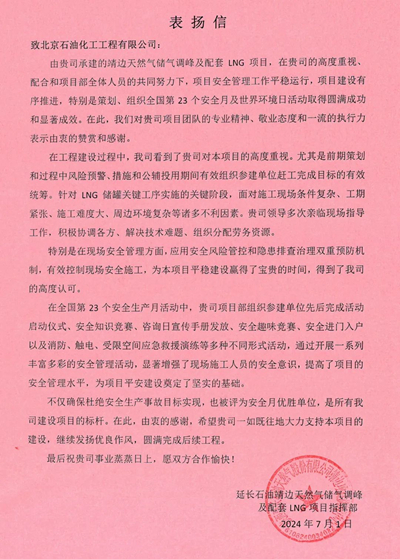 近日,由北京石油化工工程有限公司(簡(jiǎn)稱:北油工程)總承包的延長(zhǎng)石油靖邊天然氣儲(chǔ)氣調(diào)峰及配套LNG項(xiàng)目安全生產(chǎn)工作得到延長(zhǎng)石油煉化公司肯定,項(xiàng)目部獲得2024年度“安全生產(chǎn)月”活動(dòng)“先進(jìn)單位”稱號(hào),3名員工獲得“安全之星”稱號(hào)。并收到表?yè)P(yáng)信,對(duì)北油工程在項(xiàng)目建設(shè)期間,規(guī)范的安全管理,有序的項(xiàng)目建設(shè),專業(yè)的團(tuán)隊(duì)表示感謝。
