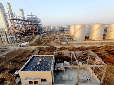 目前,項(xiàng)目整體建設(shè)完成64%,裝置鋼結(jié)構(gòu)安裝完成85%,靜設(shè)備累計(jì)安裝81臺(tái),全廠工藝熱力管網(wǎng)基礎(chǔ)及鋼結(jié)構(gòu)施工完成68%,除鹽水站、灌裝立體庫(kù)基礎(chǔ)施工中。