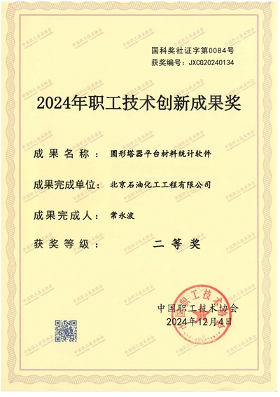 近日,在2024年全國職工技術創新成果評比中,北京石油化工工程有限公司自主研發的“圓形塔器平臺材料統計軟件”和“儀表位置圖輔助設計軟件”分別斬獲二等獎、三等獎,展現了公司在石化工程數字化領域的創新實力。