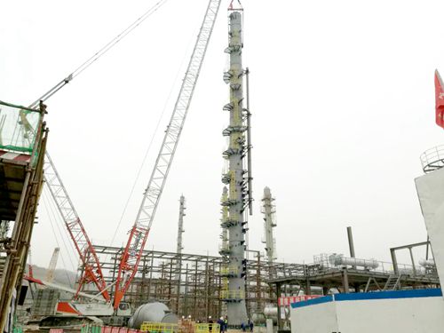 據悉,C-311全稱堿洗/水洗塔,高62.91m,重104.5噸。該設備為工藝設備中較為核心的設備之一,在整體生產過程主要起到酸性氣體脫除功能。ACO項目自2016年5月12日開工以來,克服了場地沉降、轉化器訂貨決策、E-102訂貨決策、原料變更決策(影響汽油加氫單元設計進程)、環評變更決策(增加脫硫系統)等因素,同時,較其他工藝裝置晚開工3-6個月,造成一定程度的設計、采購滯后。面對困難,ACO項目組迎難而上,于2016年12月底前實現了土建整體糾偏的總體控制目標,為2017年進入安裝年創造較好條件。